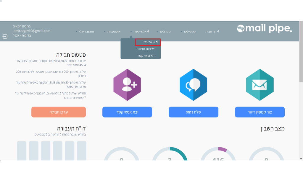 שלב 1 : מדף הבית נבחר בסרגל הבחירה העליון ב'אנשי קשר'.