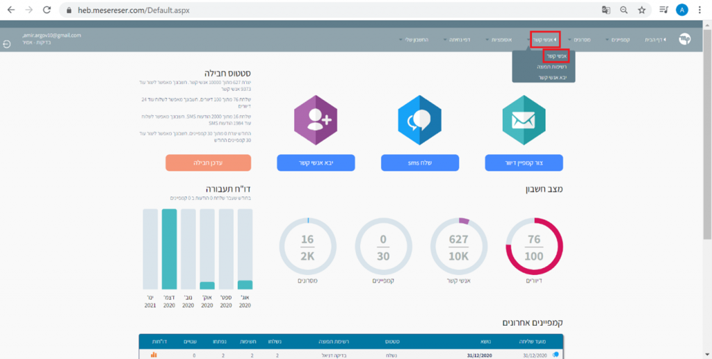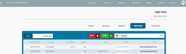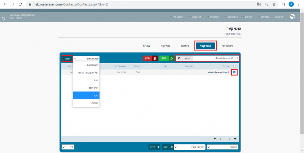 בסרגל הבחירה העליון בחר\י באנשי קשר -> אנשי קשר -> לאחר מכן יש לעבור ללשונית אנשי קשר ( השנייה מימין) -> בחיפוש יש להכניס את כתובת המייל המדוייקת של הלקוח\ה שביקש\ה הסרה (ללא כל רווחים) -> כעת אמור להופיע כרטיס איש הקשר, יש לסמן את התיבה הלבנה מצד ימין כך ש -V כחול מופיע בתוכה -> לאחר שאיש הקשר מסומן, יש לגשת לצד השמאלי העליון של התיבה היכן שמופיע "שנה סטטוס" -> בחר\י בסטטוס "הוסר" , ולחצ\י שמור על הכפתור הכחול שמופיע משמאל לסטטוס